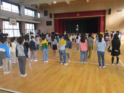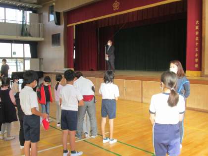また続けて、水曜日にPTA主催で行われる『アルクエスト』や、月末に十三地域主催で行われる『防災キッズあつまれ!』を取り上げて、「PTAや十三地域のみなさんが、十三の子ども達を楽しませてあげようとイベントを考え準備してくださっています。どんどん参加して楽しみましょう。」と、子ども達にお話をされました。