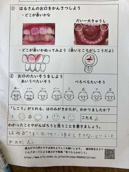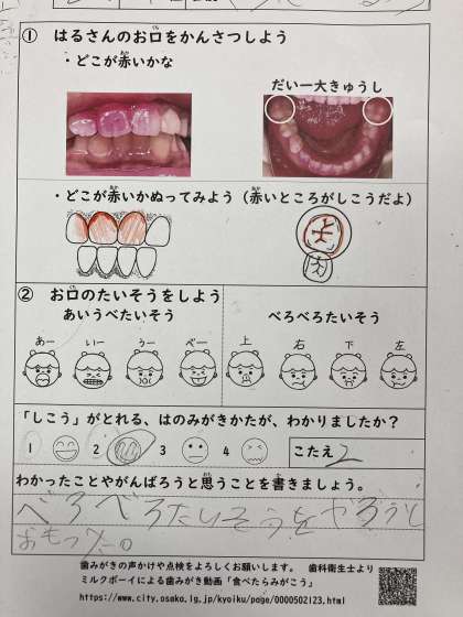 丁寧な歯みがきの仕方と一緒に、「あいうべ体操」と「べろべろ体操」を教えてもらいました。ぜひご家族で取り組んでください。
