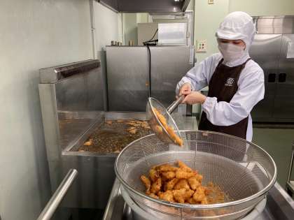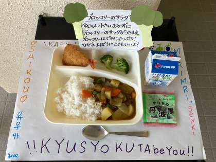 今日は「えびフライカレーライス、ブロッコリーのサラダ、ソフト黒豆、牛乳」でした。カレーライスにえびフライが添えられ、いつものカレーより豪華に感じられました。また、これから旬を迎えるブロッコリーはさっぱりとしたサラダで、カレーによく合いました。