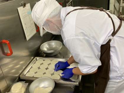 3.ぎょうざの皮に混ぜた具をのせて、200度5分間オーブンで焼く。