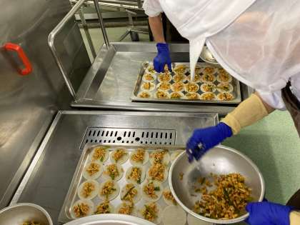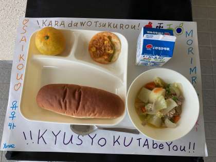 今日は「豚肉と野菜のスープ煮、変わりピザ、みかん、黒糖パン、牛乳」でした。変わりピザは、ぎょうざの皮をピザ生地にみたて、具材をのせて、焼き物機でこんがり焼きました。お家でも簡単にできるので、ぜひ、お子さんと一緒に作ってみてはいかがでしょうか?