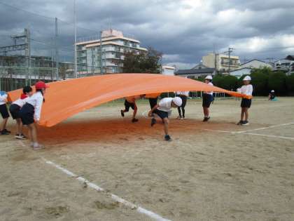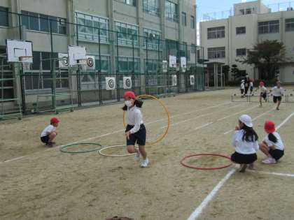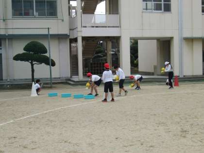 4年生の障害物走は、3年生よりも更に難所が増えます。初めての障害物走の練習で4年生が苦労したのが、平たいコーンの上にボールを乗せて運ぶゲームです。慌てるとコーンからボールが落ちて、「おっとっと」。