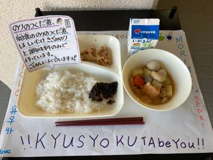 今日は「関東煮、れんこんの梅風味焼き、のりのつくだ煮、ごはん、牛乳」でした。のりのつくだ煮は、ごはんによく合い、たっぷりつけても辛すぎず人気がありました。