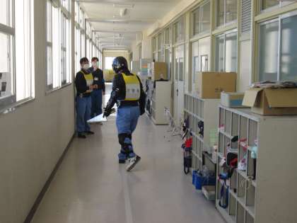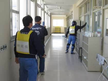 不審者を確認し校内放送で連絡があると、各教室では扉や窓を施錠して、離れた場所に移動させて安全の確保に努めます。子どもは事前に防犯のビデオを見て学習し、先生の指示に従って教室内で実際に動いて訓練をしました。