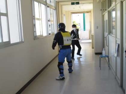 子ども達が教室で安全確保の状態をとったタイミングを見計らって、不審者役の方が廊下を歩くお芝居をしてくださったので、緊迫感のある不審者対応訓練になりました。