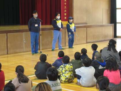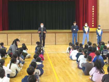 セーフティー淀川の方からは、「十三小学校のみなさんは先生の指示をよく聞いて、静かに待つことができていました。しかし、いつも先生がいるとは限りません。登下校の時などに不審な人に会ったら、大きな声を出して大人の人に助けを求めてください。」と、身を守るためのアドバイスをいただきました。
