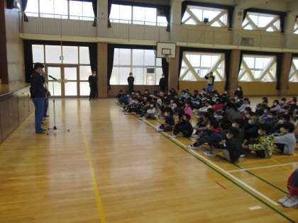 不審者を警察に引き渡した設定で、「校内の安全が確認されました。」という放送が流れた後、全校児童が講堂に集まって訓練のふりかえりをしました。