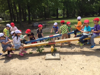 千里北公園に着くと、トイレの近くに遊具があり、20分ほど遊具で遊びました。校区に遊具のある公園がない子どもたちにとっては、とても楽しい時間だったようです。初めて、シーソーに乗ったという子が沢山いました。