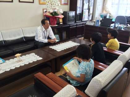 校長室、職員室、事務室、保健室、管理作業室では、それぞれのお部屋に入り、インタビューを試みました。校長室では、ソファーに座らせてもらって、なんだか緊張気味の子ども達でした。