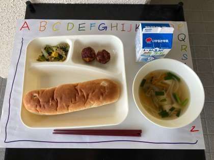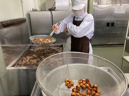 今日は「あげシューマイ、とうふのスープ、ツナとチンゲンサイのいためもの、おさつパン、牛乳」でした。あげシューマイは中学校は一人3個、小学校は一人2個です。「もっと食べたい」という声をたくさん聞きました。低温で黒くならないようにじっくり揚げました。