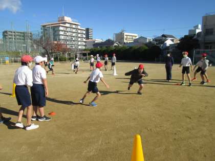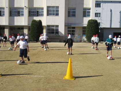 鬼ごっこで体が充分に温まったので、いよいよボールを持って練習します。ドリブルは最初、ボールがあちらこちらに転がって追いかけていましたが、「ボールが足から遠く離れないように、優しく蹴って前に進めよう。」と教えていただくと格段に操作が上手になりました。