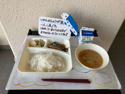 いわしのしょうが煮は、骨ごと食べられるように調理しましたが、骨が気になる児童は無理のないように食べるようにと話をしました。