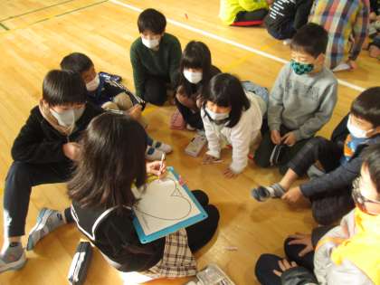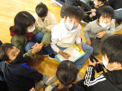 次に学校生活でよくトラブルになる場面を取り上げて、どのような『わたしメッセージ』を伝えれば良いかを、たてわり班で輪になって考えました。