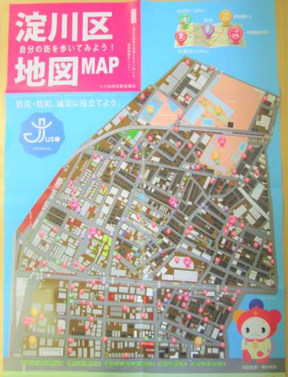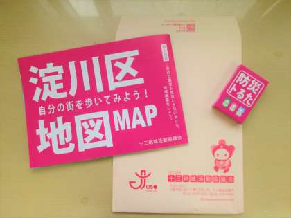 まずは大きくてカラフルな十三地域の防災マップです。地震などが起こったときの一時避難集合場所や、津波警報が出たときの津波避難ビルなどが、とても分かりやすく表示されています。お子様が防災マップを持ち帰りましたらぜひご家族でご覧になって、災害時の約束事などについてお話をするのに役立ててください。
