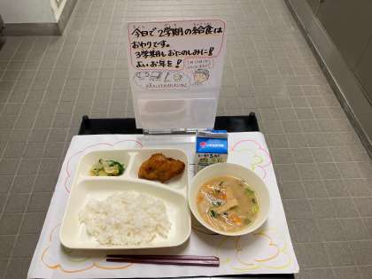 3学期の給食は、1月12日(水)からです。給食着、4点セットのマスク、ランチョンマット、歯ブラシ、コップを忘れずに持たせてください。