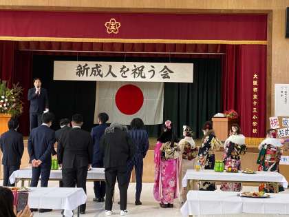 十三地域が主催となって、「新成人を祝う会」が小学校の講堂で行われました。8年前に十三小学校を巣立った卒業生の中から15人の新成人が集い、地域の方々からのあたたかいに祝福に笑顔を見せていました。