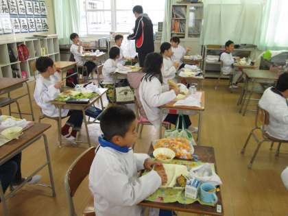 4年生の教室では配膳が終わって食べ始めてから、担任の先生が「パンのおかわりのほしい人?」など、パンやおかずのおかわりを尋ねます。すると、おかわりのほしい子が、「……。」と声を出さずに勢いよく手を挙げます。