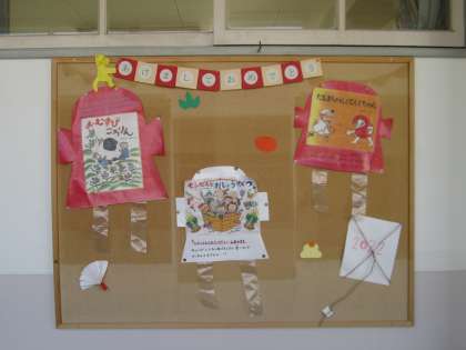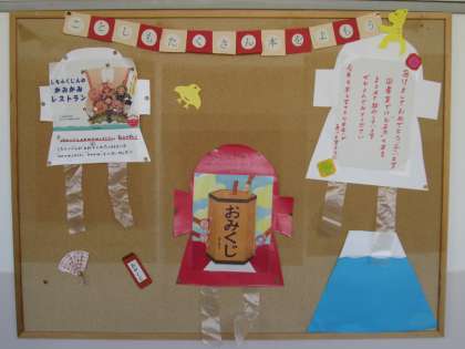 図書室の中にも「お正月」の特設コーナーが設けられていて、お正月を題材にした絵本や、鏡餅やしめ縄といった文化や歴史に関する本、またおせちやお雑煮などの食育の本が並んでいます。