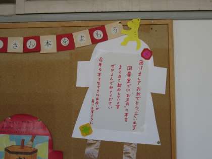 3学期がスタートして一週間がたちました。図書室の前のボードには、図書支援コーディネーターさんから子ども達へのメッセージが掲示されています。