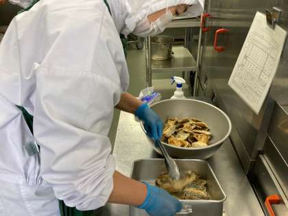 今日は「あじのレモンマリネ、てぼ豆のスープ煮、固形チーズ、黒糖パン、牛乳」でした。あじのレモンマリネには生のレモン汁を使ったマリネ液を揚げたあじにかけました。てぼ豆のスープ煮に使われているてぼ豆は、血液をつくる鉄も多く含まれ、栄養豊かなスープ煮でした。