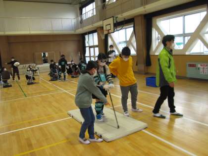 初めはマットの上を歩きます。白く曇ったゴーグルをつけているので足元が見にくく、膝や足首が重いので、マットの縁の5cmほどの段差でもつまづきそうになります。横で介助するお友達が、「マットがありますよ。」や「段があるから気を付けて。」など、優しい声で教えてあげました。