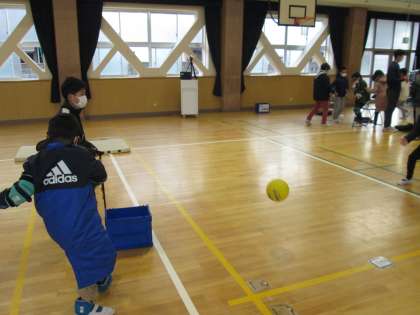 最後は子ども達が体育や休み時間にやっている、大好きなボール投げです。お友達に向かってボールを投げようとしますが、体が思うように動かせずにとんでもない方向に投げてしまいます。