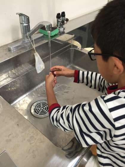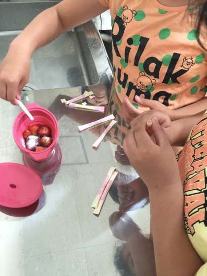 まず、いちごを洗い、重さを計りました。そのあと砂糖をいちごの三分の一、分量を計算していれました。