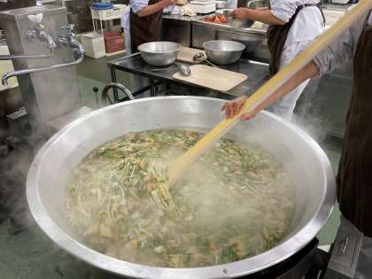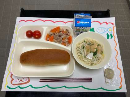 今日は「豚肉と野菜の煮もの、なにわうどん、プチトマト、黒糖パン、牛乳」でした。なにわうどんは、別に炊いた三角の揚げを加え、食べる時にとろろこんぶをのせて食べます。大阪らしいうどんで、児童にも人気がありました。