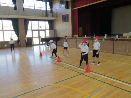 フワフワの綿に包まれたやわらかいボールを使って、上から勢いよく遠くに投げる投げ方と、下から山なりに投げる投げ方を練習します。上から投げる練習では、講堂の端からボールを高く遠くに投げたり、上から吊るされたフラフープの中を通したりします。下から山なりで投げる練習では、床に置かれた箱の中にボールを入れるために、腕をゆっくり振ってボールを放ちます。