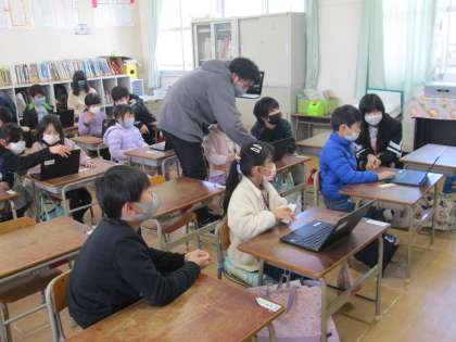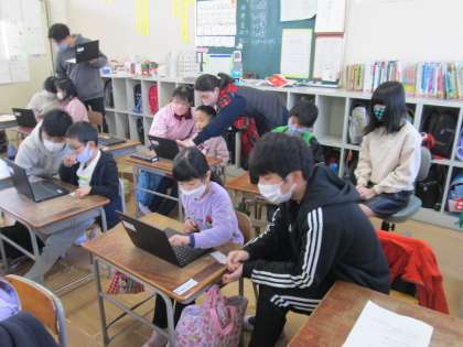 小さな1年生の横から、大きなお兄さんとお姉さんが「@マークは右の方にあるよ。」とヒントをあげて導いてあげている場面が微笑ましかったです。