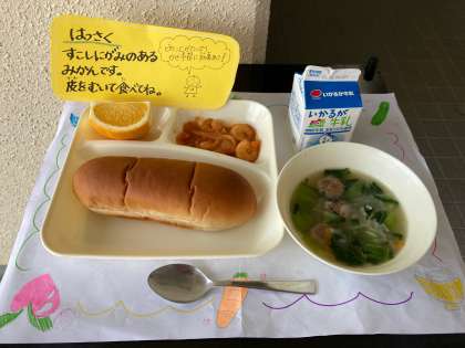 今日は「えびのチリソースいため、中華がゆ、はっさく、黒糖パン、牛乳」でした。今日はデザートにはっさくが登場しました。はっさくは、皮が固く、少し苦みのあるみかんですが、ビタミンCを多く含み、風邪予防などに有効とされています。