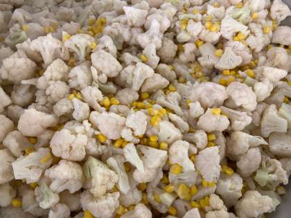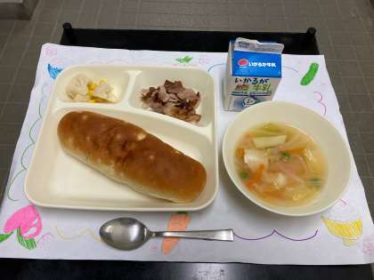 今日は「豚肉のガーリック焼き、スープ、カリフラワーとコーンのサラダ、おさつパン、牛乳」でした。カリフラワーとコーンのサラダのカリフラワーはひと口大に切って、ゆでました。カリフラワーは少しゆですぎただけで、やわらかくなってしまうのでが、絶妙なゆで加減で、おいしいサラダでした。