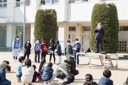 一年間、児童集会やなかよし遠足でいっしょに活動をしたたてわり班対抗で、1年生から6年生までが交じってスポーツを楽しみます。