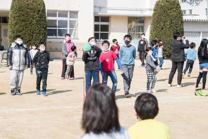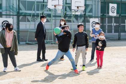 低学年の子ども達も安全に楽しく参加できるように、3年生以上のお兄さんとお姉さんは「利き腕と反対の腕を使ってボールを投げる」という特別ルールです。ふだん使い慣れていない腕を使うので、ボールが思ったように投げられずハプニング続出のゲームになりました。