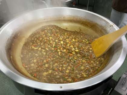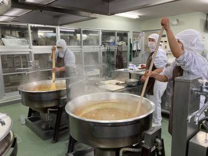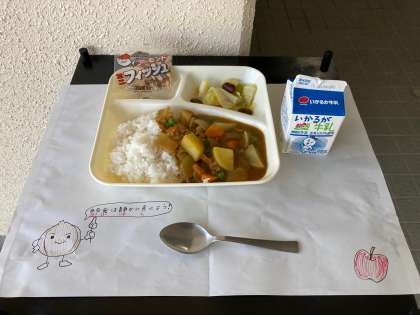 今日は「チキンカレーライス、キャベツと金時豆のサラダ、アーモンドフィッシュ、牛乳」でした。給食のカレーは特別!?いつも大人気です。