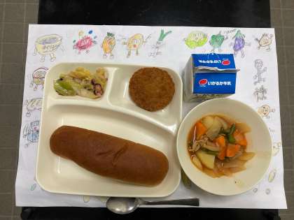 今日の給食「チキンレバーカツ、ケチャップ煮、たことキャベツのバジルソテー、黒糖パン、牛乳」でした。