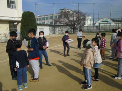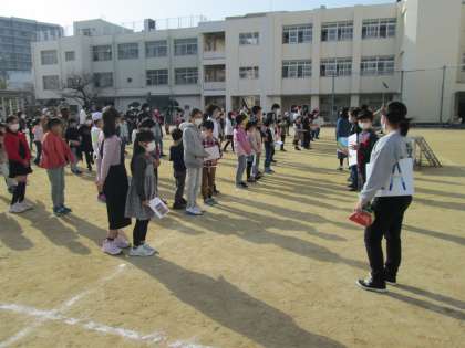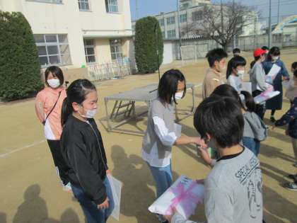 6年生からもお返しの贈り物がありました。新しい学年になってピカピカの教室で学習をしてほしいという願いを込めて、家庭科の学習でつくったぞうきんを包んで、リボンで飾って渡します。