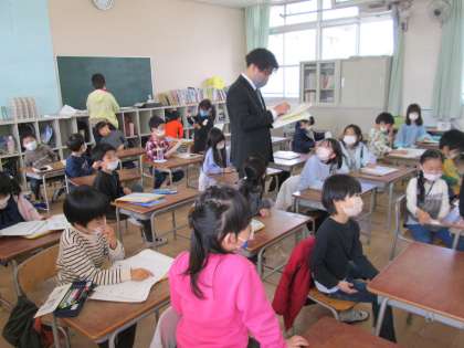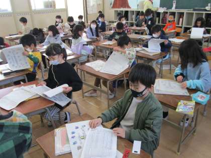 1年生の教室で過ごす、最後の日。教室では担任の先生が、これまで学習したプリントやお手紙を配っていました。4月からは新しい弟や妹がこの教室に入ってくるので、机の中ものぞいて全部きれいにお片付けします。
