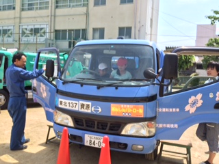 パッカー車の仕組みや操作のしかたについても教えてもらい、自分たちで操作をしてごみを入れる体験もさせていただきました。また、運転席にもすわらせていただくことで、運転手さんから見えない場所があることにも気づき、お仕事中の車のそばには近づいてはいけないこともわかりました。