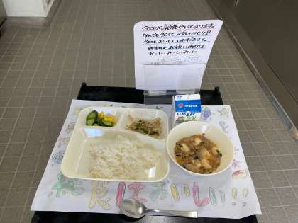 今年度最初の給食は「マーボーどうふ、きゅうりとコーンの甘酢あえ、もやしとピーマンのごまいため、ごはん、牛乳」でした。