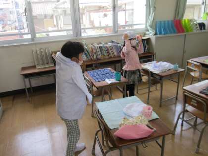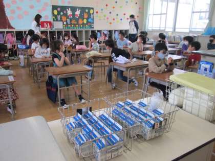 初めての給食で、白衣への着替えや配膳に時間がかかるため、しばらくは4時限目の途中から給食の準備にとりかかります。