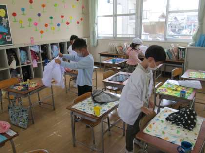 担任の先生のお話をよく聞いて机の上にナフキンを敷いてコップを置き、給食の白衣に着替えます。着替えた1年生が席に着くと、新しくて真っ白な白衣で教室が明るくなりました。