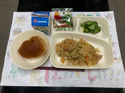今日は「焼きそば、きゅうりのしょうがづけ、豆こんぶ、黒糖パン1/2、牛乳」でした。焼きそばは、定番のソース味で野菜もたっぷり入っていました。野菜がたっぷりでしたが、みんなよく食べていました。
