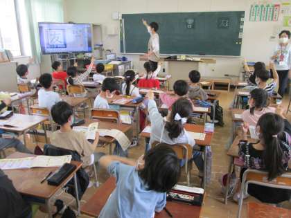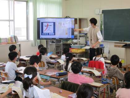 「『友』の字はカタカナが2つ隠れていますね。」と担任の先生が言うと、2年生の子ども達は大型テレビに映し出された文字をジーッと見つめます。先生と書き順を確認したあと、みんなで人差し指をのばして何度も空書きをします。