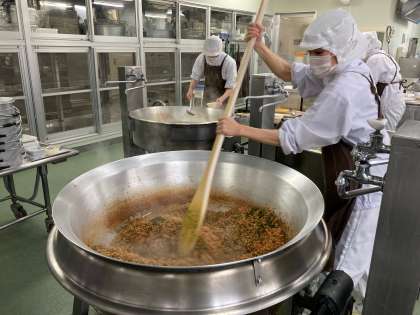 ごはんに添える「紅ざけそぼろ」は味のついていない紅ざけのフレークにいりごま、青のり、料理酒、みりん、うすくちしょうゆで味をつけた、素朴な味の手作りのふりかけでした。ごはんによく合って、みんなよく食べていました。