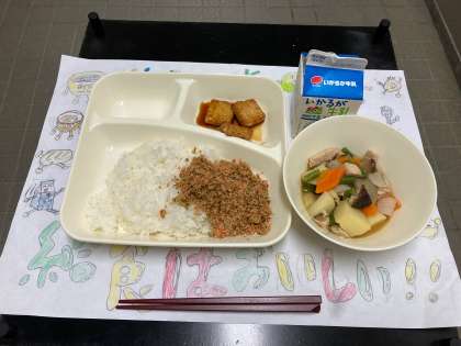 今日は「鶏肉とじゃがいもの煮もの、あつあげのしょうゆだれかけ、紅ざけそぼろ、ごはん、牛乳」でした。
