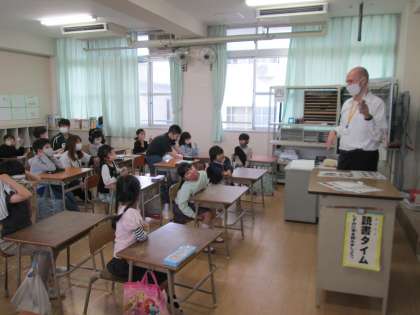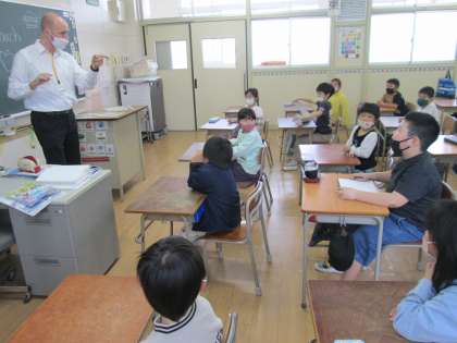 3年生の子ども達の前に立ったのは、大きなKory先生です。1回目の授業はKory先生の自己紹介とクイズをしました。