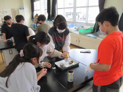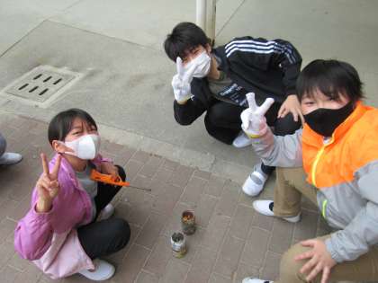 理科室に戻り、バットの上に二つのカンの中身を見比べてみます。上が開いているカンの方は割り箸が燃え切らずに残っていましたが、側面に穴の開いたカンの方は割り箸がすっかり燃えて灰になっていました。残った割り箸の様子がぜんぜん違うので、子ども達はとても驚いていました。