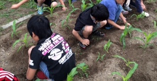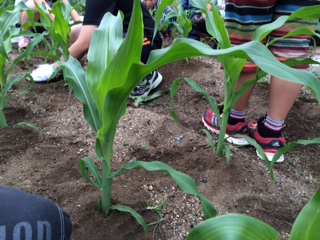 この日は、みんなで草ぬきをし、間引いたあとのとうもろこしに土寄せをしました。