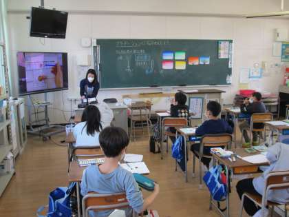 5年生の子ども達が、真剣な表情で担任の先生のお話を聞いています。担任の先生が手元を大型テレビに映しながら、上手にグラデーションを描くコツを指導しました。今回の図工では絵の具を使ってグラデーションを描き、作品づくりに挑戦するようです。